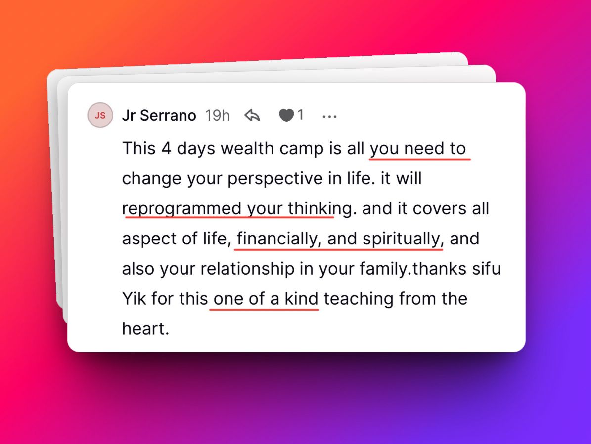 For just $77, you can join Sifu Yik's transformative 4-Day Wealth Training Camp that has already changed countless lives worldwide.